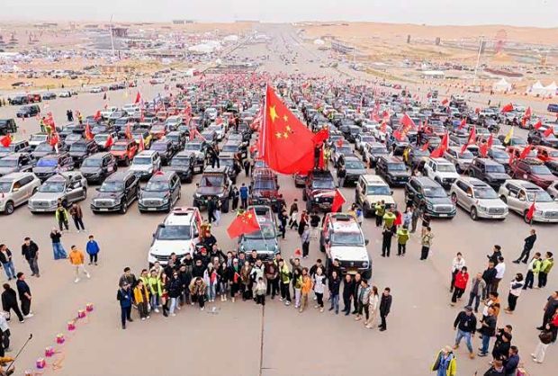 上午10:01,随着指挥车一声令下,这支钢铁长城开始缓缓移动,向着沙漠中的绿洲月亮湖昂扬进发。从空中俯瞰,车队犹如一条蜿蜒的巨龙,在金色的沙海中划出坚定的轨迹。数量值得载入史册的单一品牌车队集结,不仅彰显了“坦克团”越野用户群体的强大凝聚力,更以这种独特的方式,向伟大的祖国母亲献上来自中国越野人最崇高的敬意。