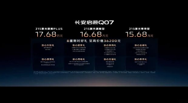 10月10日,长安启源Q07天枢智能驾驶辅助激光版正式登场,此次共推出3款配置车型,售价区间15.68万-17.68万元,分别为215激光尊荣型(15.68万)、215激光旗舰型(16.68万)、215激光旗舰PLUS(17.68万),凭借硬核配置成为15-18万级混动SUV市场焦点。
