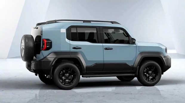 车身侧面紧凑,相比上代三门布局,新一代升级为五门设计,虽车门尺寸不大,但提升日常实用性。宽大C柱是标志性元素,搭配外扩轮眉、黑色侧裙及黑化轮圈,强化越野氛围,视觉上更显力量感,仿佛随时能征服复杂路况。