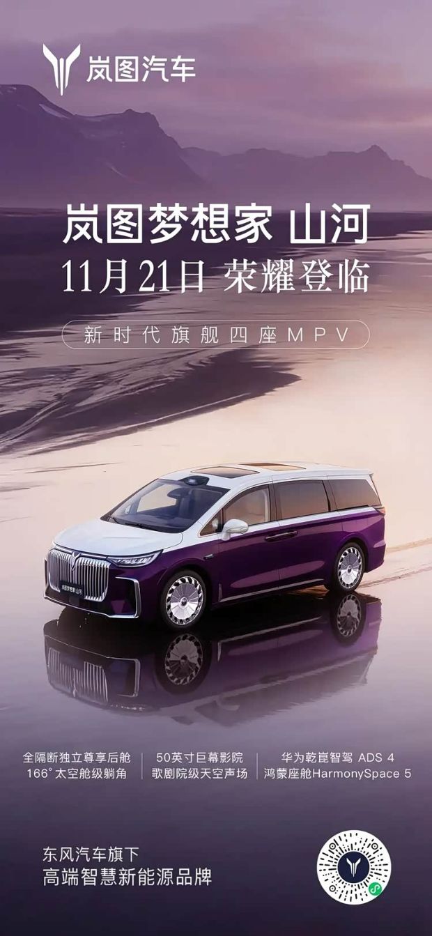 11月11日,岚图汽车官方宣布梦想家·山河将于广州车展迎来正式上市。新车与普通版车型最大的区别为采用了四座版车型,并使用了双色车身设计。官方表示,新车将于2025年四季度开启交付。