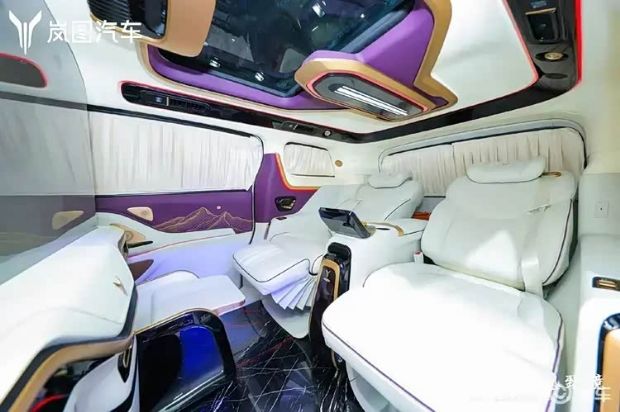 内饰方面,新车最大的亮点就是采用了四座布局,后排配备了航空级真皮座椅,舒适度大幅提升。同时,新车采用了大理石材质的地板并在门板上有有着山河刺绣。
