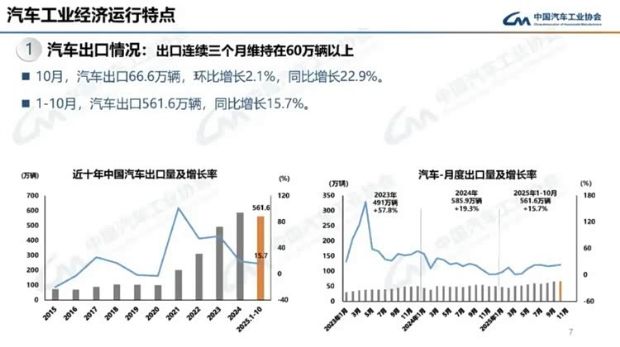 近日,中国汽车工业协会发布的最新数据显示:我国新能源汽车出口首超200万辆。1-10月汽车出口561.6万辆,同比增长15.7%。