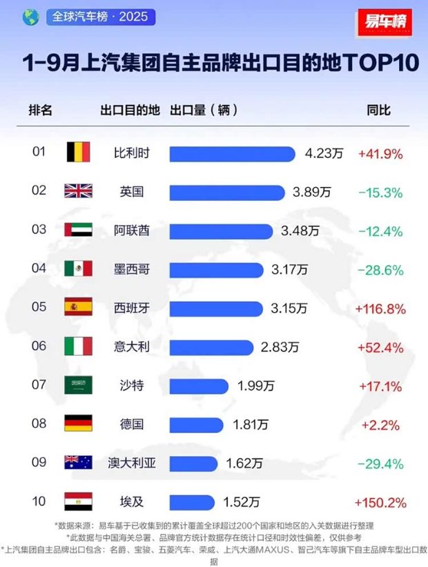 1-9月上汽集团出口目的地前3名国家分别为:比利时、英国、阿联酋。西班牙和埃及市场同比增幅最为明显,分别为116.8%和150.2%。