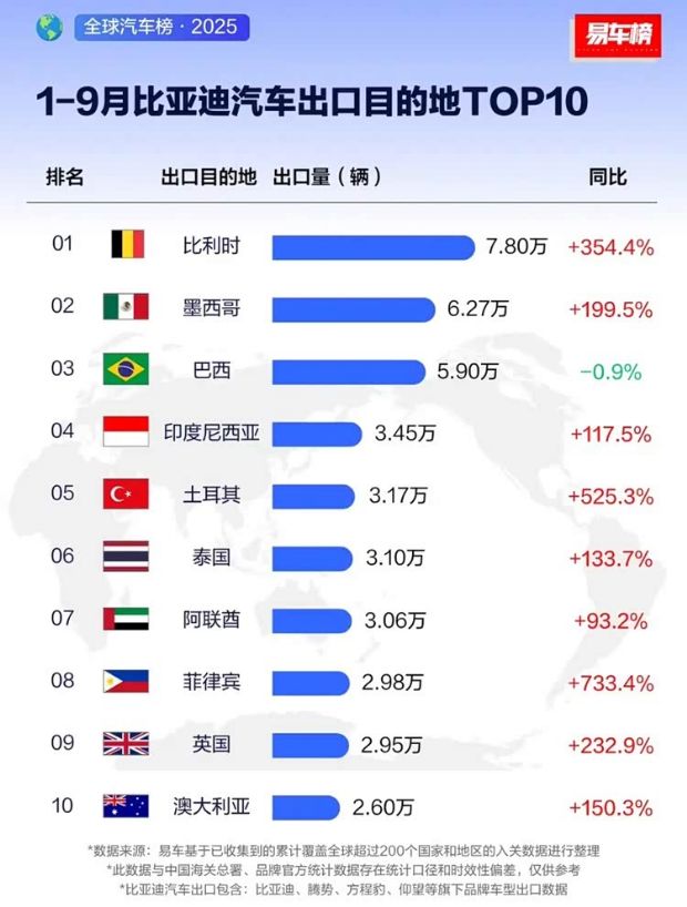 易车近期统计了1-9月部分中国汽车品牌(比亚迪汽车、奇瑞汽车、上汽集团)出口目的地TOP10,可以更直观的看出中国品牌在哪些国家更畅销。数据显示:1-9月比亚迪汽车出口目的地前3名国家分别为:比利时、墨西哥、巴西。巴西负增长或与比亚迪在巴西建厂有关,菲律宾市场增速最快,达到733.4%。