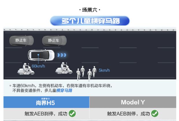 另一大高难度测试项目,多儿童横穿的“鬼探头”场景,更能考验辅助驾驶系统的应急反应能力。测试设定为城区道路,车辆以60km/h正常行驶,突然有4名“儿童”横穿马路,且车辆左侧有同向机动车、右侧有非机动车行驶,完全不具备变道避让的条件。华为乾崑智驾ADS 4系统迅速触发AEB自动紧急制动功能,精准控制刹车力度,最终将车辆稳稳停在安全距离内,成功避免碰撞风险。