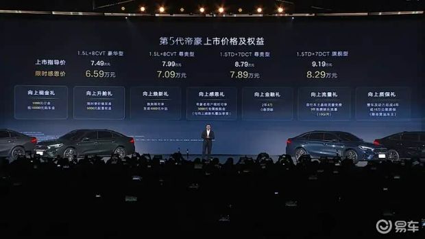 11月18日,第5代吉利帝豪正式上市,新车共推出4款配置,上市指导价7.49-9.19万元,同时官方推出限时活动,限时感恩价6.59-8.29万元。第5代帝豪依然定位紧凑型车,搭载1.5T+7DCT与1.5L+CVT(模拟8速)两套动力总成。