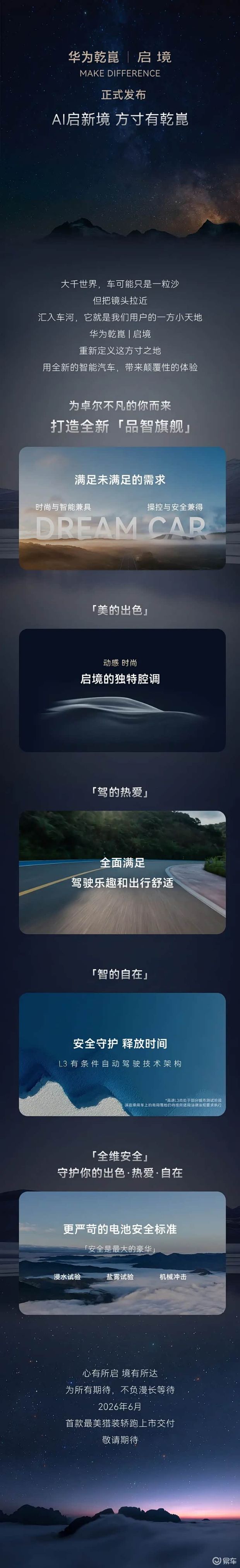 品牌释义方面,“启”代表开启、启新,“境”代表境界、新境。合作形式方面,启境汽车将全系搭载华为乾崑最先进的智能技术。华为在辅助驾驶、智能座舱、用户生态和品牌营销方面的强大实力,结合广汽在三电技术与整车制造领域的专长,双方优势互补、紧密协作,共同为启境品牌注入强大竞争力。华为数百人团队常驻广汽合署办公,从产品定义到营销全程陪跑。
