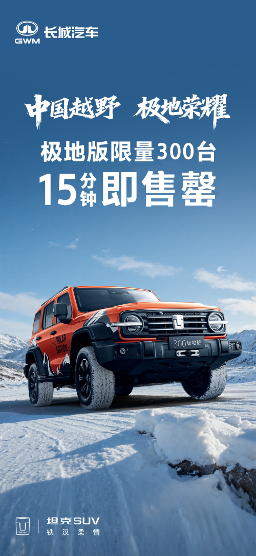 2025年11月21日,坦克300极地版在第二十三届中国广州国际汽车展览会上,正式开启预订,仅用时15分钟,300台便全部售罄。作为坦克300系列第14款版本,这款承载“中国南北极考察选用产品”荣耀身份、凝聚用户共创智慧的硬派越野车型,凭借经南极科考认可的硬核品质,成为车展焦点,引发媒体与公众广泛关注。