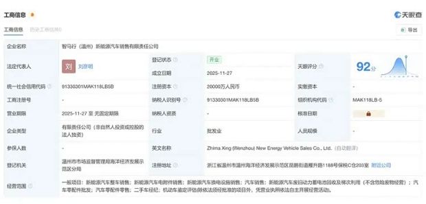 近日,据天眼查公开信息显示,智马行(温州)新能源汽车销售有限责任公司成立,法定代表人为刘彦明,注册资本20000万人民币,由威马汽车制造温州有限公司全资持股。