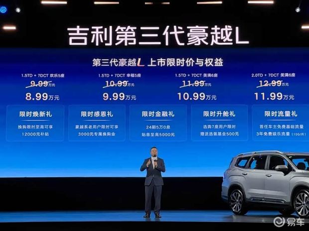 11月27日,吉利第三代豪越L正式上市,包含四款车型,官方指导价区间9.99-12.99万元,此外上市限时享交1000元抵11000元购车金,优惠后限时权益价区间8.99-11.99万元。新车采用最新的家族设计语言,并在配置和空间上进行了全面升级革新。动力方面在保留2.0T发动机的基础上新增1.5T版本。