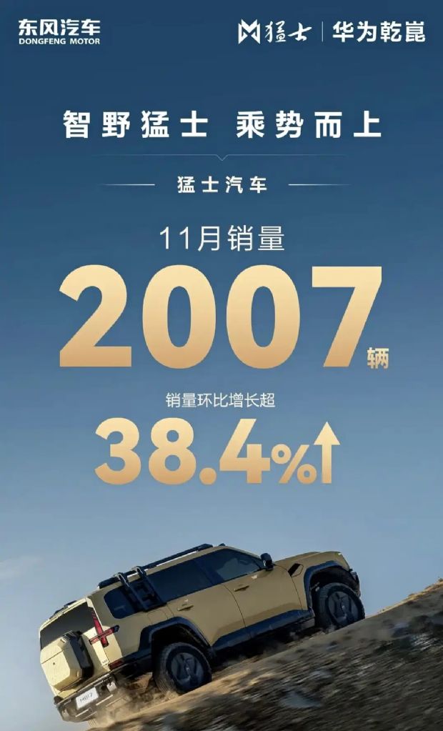 12月1日,我们从官方获悉,猛士汽车11月销量2007辆,环比增长超38.4%。不久前的广州车展上,猛士M817 Hero正式上市, 售价30.19万元。新车相比于之前的版本车型,去掉了激光雷达以及空气悬架,不过其在动力以及与越野性能方面依旧出众。