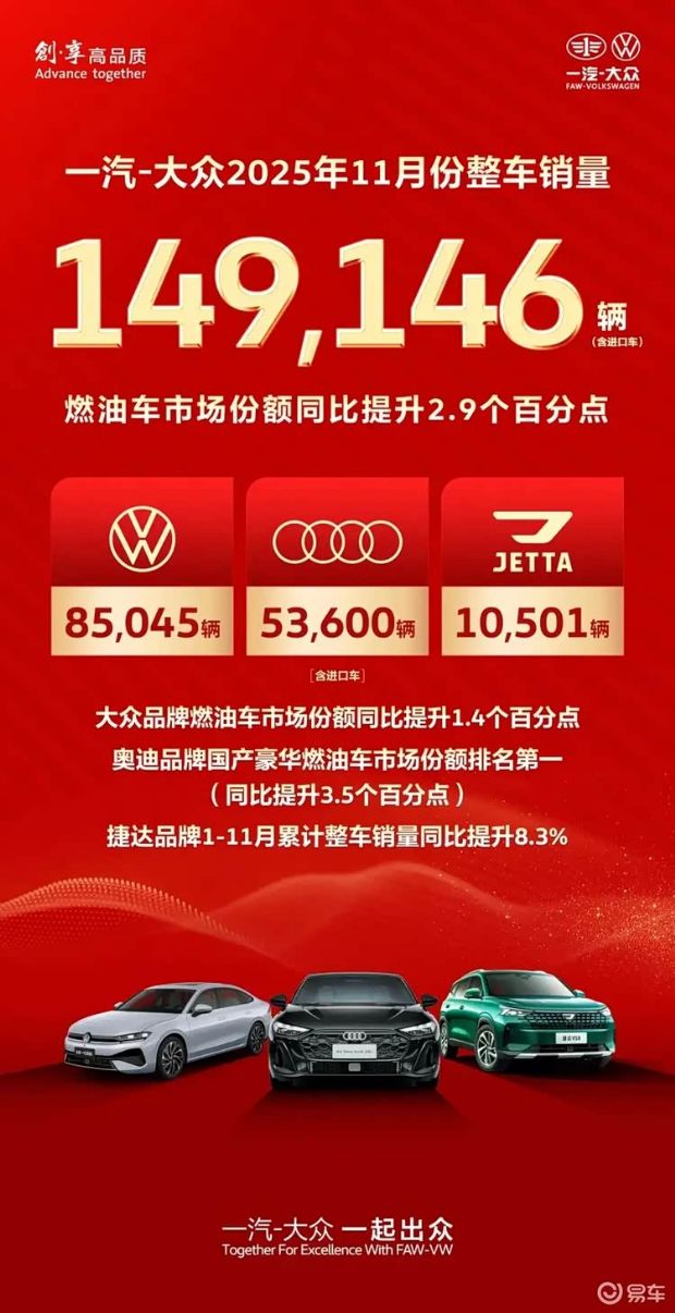 近日,一汽-大众发布最新销量业绩:11月实现整车销售149146辆(含进口车),燃油车市场份额同比提升2.9%。旗下三大品牌燃油车市场份额全部实现同比正增长。