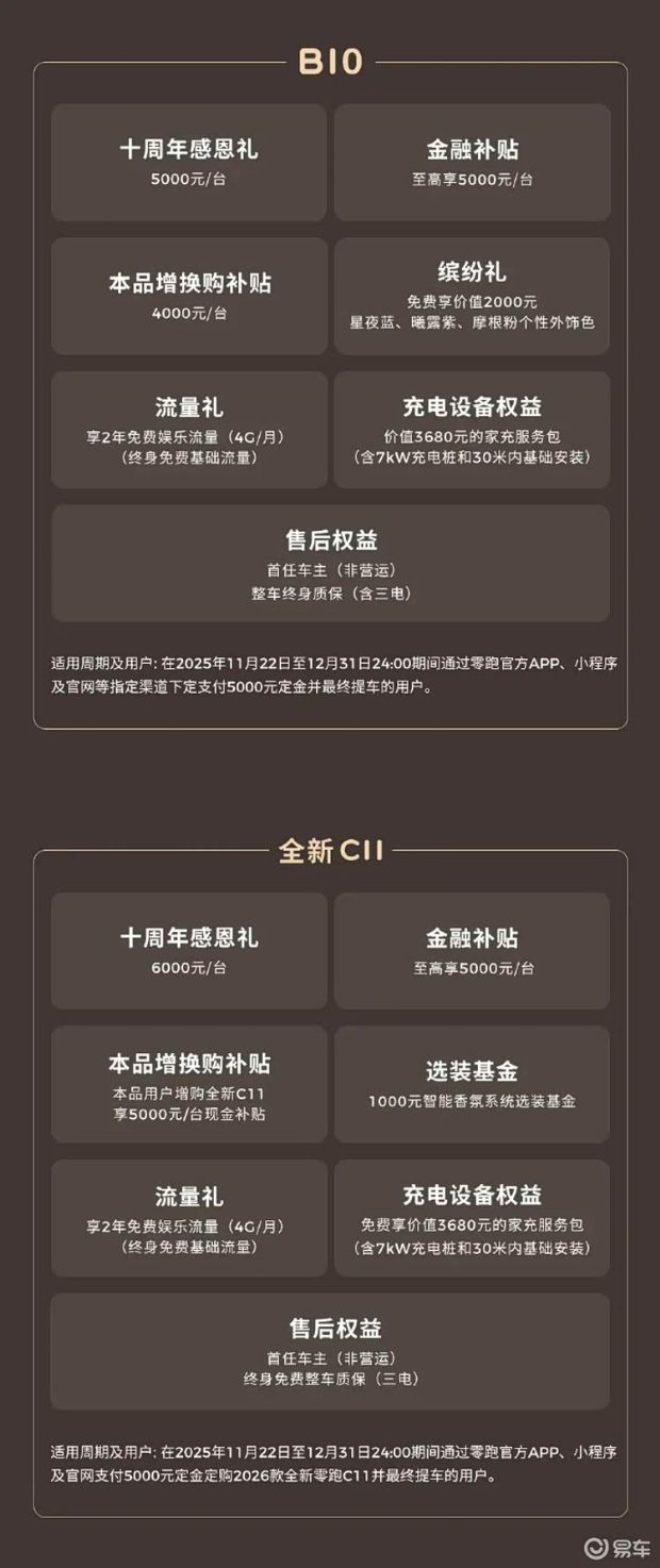零跑B10推出5000元十周年感恩礼;至高5000元金融补贴;本品赠换购补贴4000元以及限时免费享价值2000元个性外饰色的多重购车礼。全新C11推出6000元十周年感恩礼至高5000元金融补贴;本品赠换购补贴5000元。