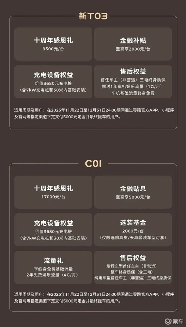 新T03可享受9500元现金优惠,至高2000元金融补贴。C01享17000元现金优惠,至高5000元金融补贴,2000元选装基金。