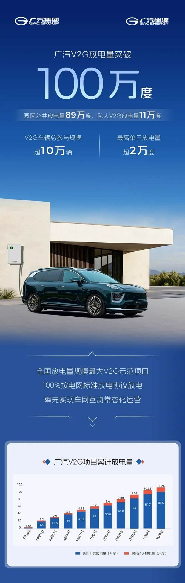 日前,广汽集团官方宣布广汽V2G项目累计放电量突破100万度。其中,园区公共放电量89万度,私人V2G放电量11万度。