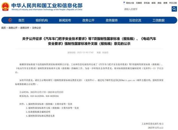 日前,工信部官网发布了关于公开征求《汽车车门把手安全技术要求》等7项强制性国家标准(报批稿)、《电动汽车安全要求》强制性国家标准外文版(报批稿)意见的公示。工信部表示,根据国家标准委下达的强制性国家标准制修订计划组织完成了《汽车车门把手安全技术要求》等7项强制性国家标准(报批稿)、《电动汽车安全要求》强制性国家标准外文版(报批稿)的编制工作。为进一步听取社会各界意见,现对标准报批稿及编制说明予以公示。公示时间为2025年12月17日-2025年12月23日。