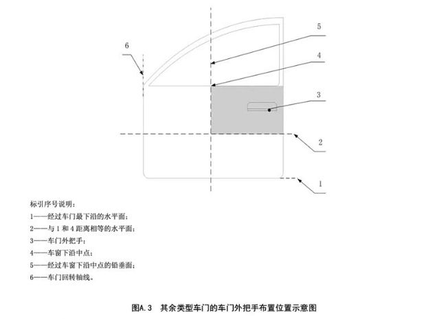 4.1.1.2 车门外把手应位于附录 A 规定的阴影区域内,或邻近阴影区域的车门或车门框架附近区域。平动开启车门的阴影区域如图 A.1 所示,向上旋转开启车门的阴影区域如图 A.2 所示,其他类型车门的阴影区域如图 A.3 所示。