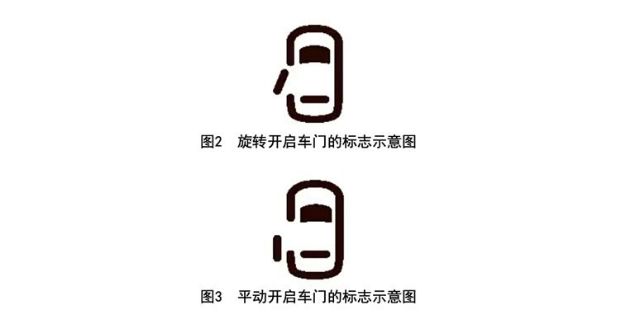 a) 根据车门开启方式,标志的图形如图 2 或图 3 所示,准许图形镜像表示,图形尺寸至少为 10mm×7mm,可对图形线条的粗细、间隙、图形的比例、弧线弧度、导角等进行调整,但不改变标志的车门、车体、前后风窗等基本构成要素,不影响使用时的可辨认性,可附加中文描述;