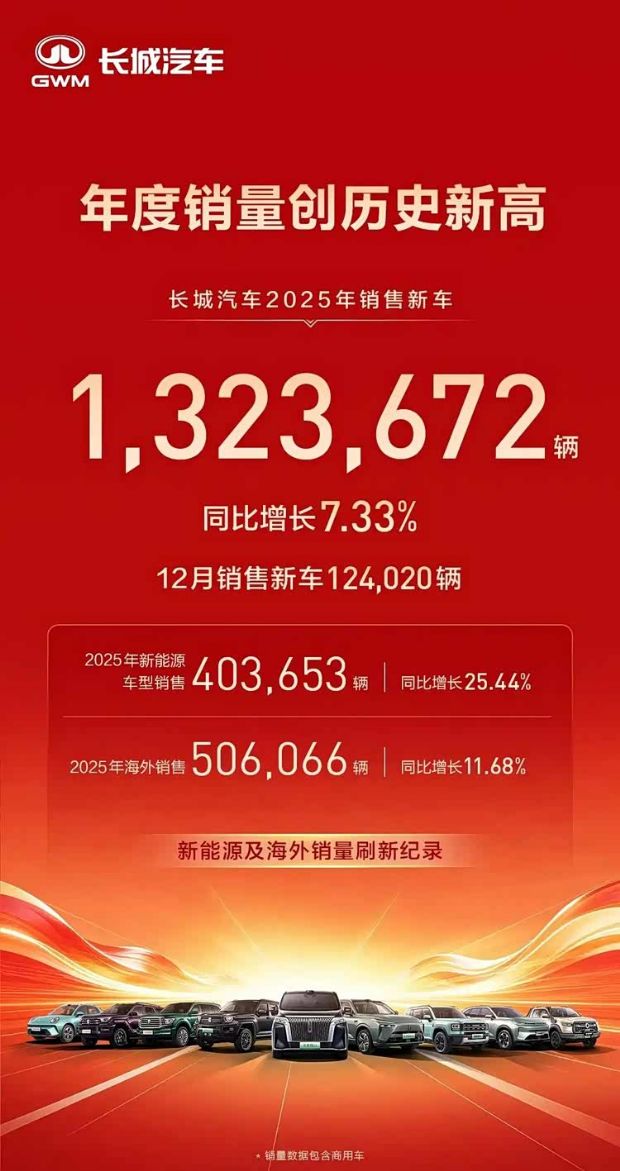 长城汽车2025年全年汽车销量132.37万辆,同比增长7.33%,连续第十年销量破百万。其中新能源销量40.37万辆,同比增长25.44%;海外销量50.61万辆,同比增长11.68%,均刷新历史纪录。